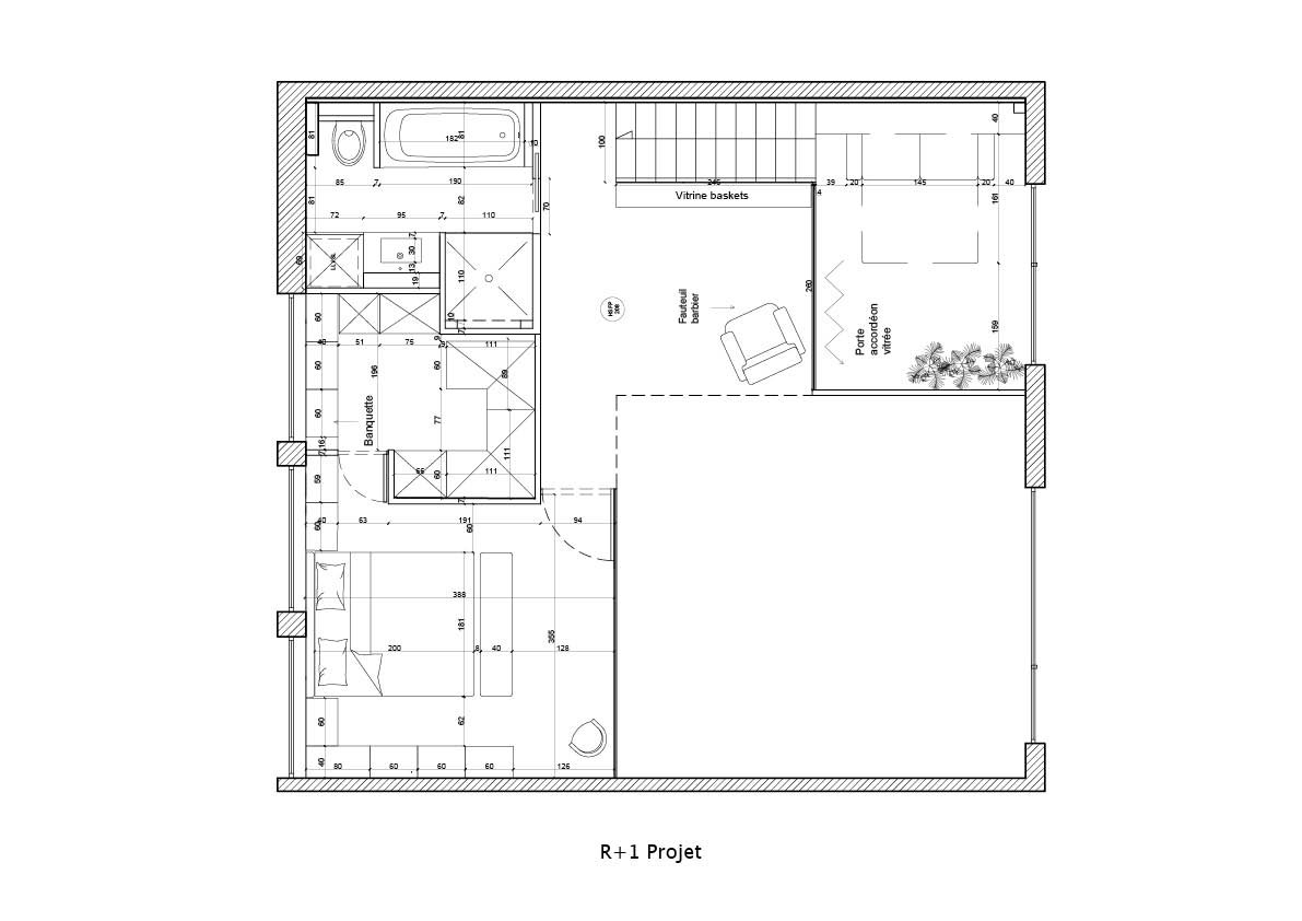 Dans la mezzanine, les espaces ont été remodelés pour y créer un dressing attenant à la chambre, un bureau qui sert aussi de chambre d’amis, une salle de de bain comportant une baignoire et une douche et enfin, un palier accueillant une impressionnante Collection de baskets.
