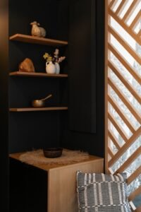 C’est ensuite grâce aux choix de couleurs et au dessin d’éléments de menuiserie sur-mesure, que les espaces ont visuellement été redéfinis et que l’ensemble a gagné en cachet.