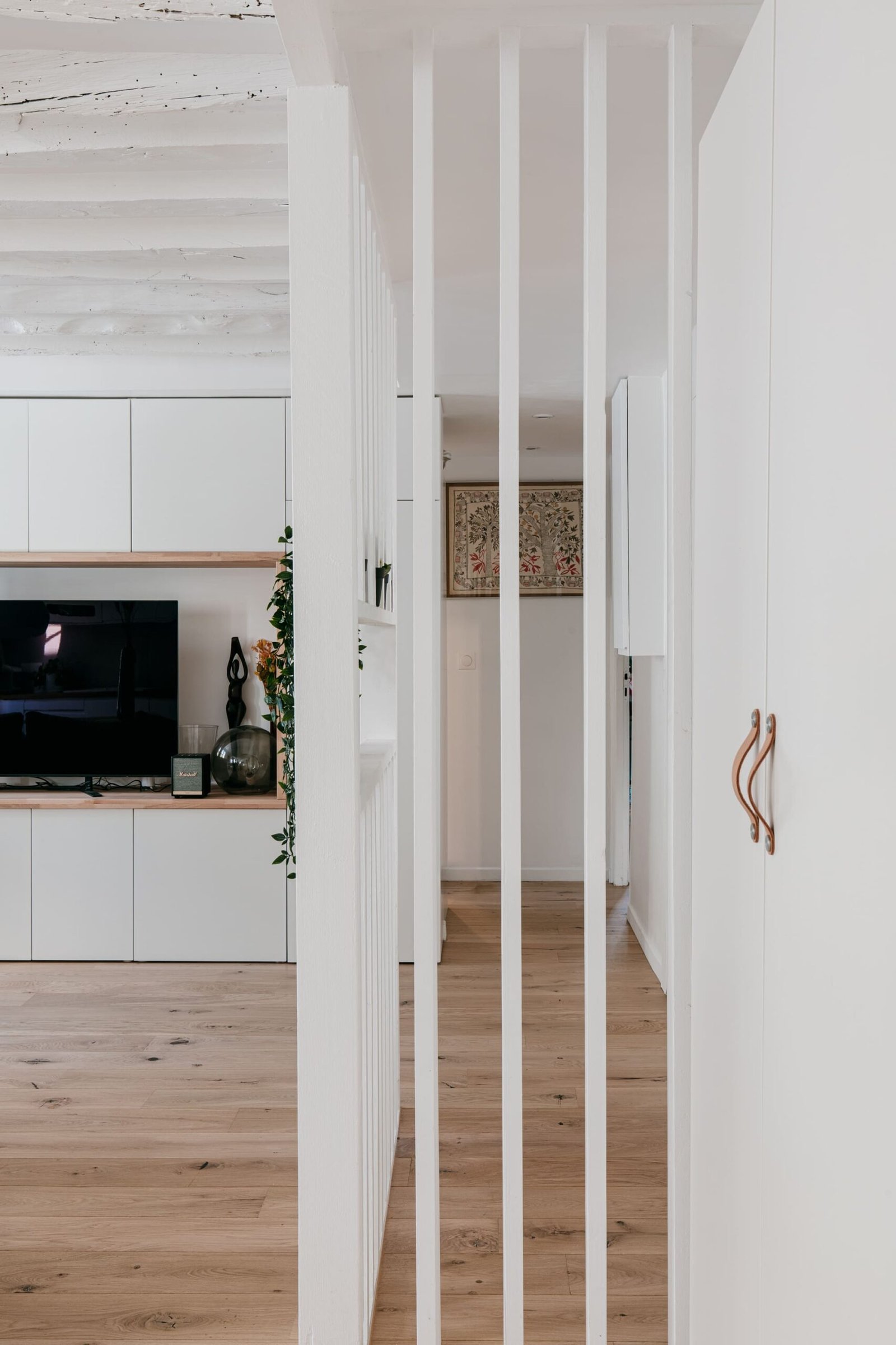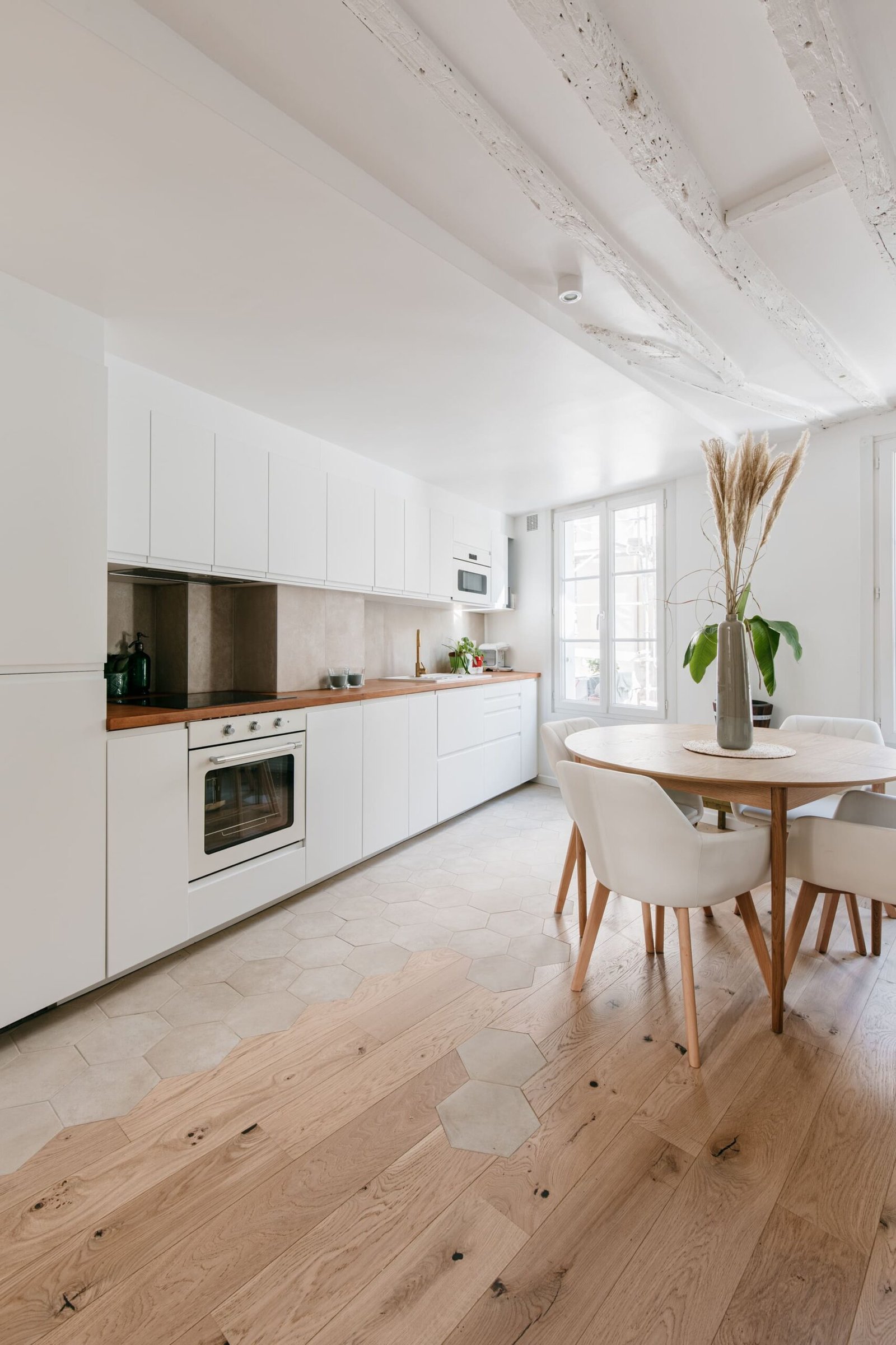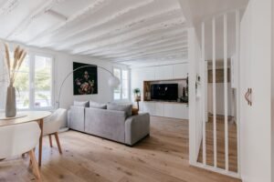 Tous les espaces ont été déplacés ou créés, jusqu’à racheter les toilettes inutilisées se trouvant sur le palier de l’étage pour les intégrer dans le nouvel agencement de cet appartement. De magnifiques poutres apparentes ont été découvertes et restaurées ce qui confère un charme tout particulier à cet appartement.