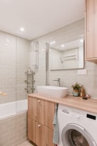 Dans ce lieu, chaque pièce a été optimisée au maximum de son potentiel grâce à un important travail de menuiseries sur mesure. L’entrée comporte de nombreux rangements et s’ouvre sur une pièce de vie combinant cuisine, salle à manger et salon. Le tout a été travaillé pour obtenir un espace dégagé et lumineux qui répond parfaitement au mode de vie de ses occupants.
