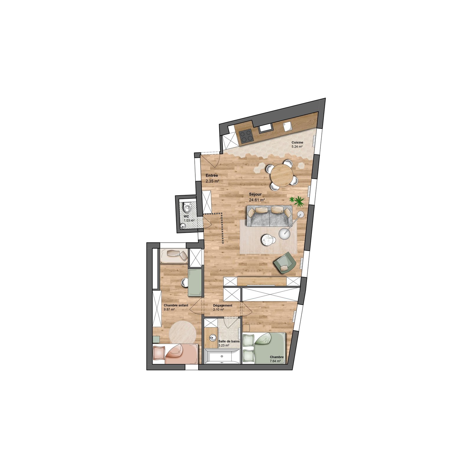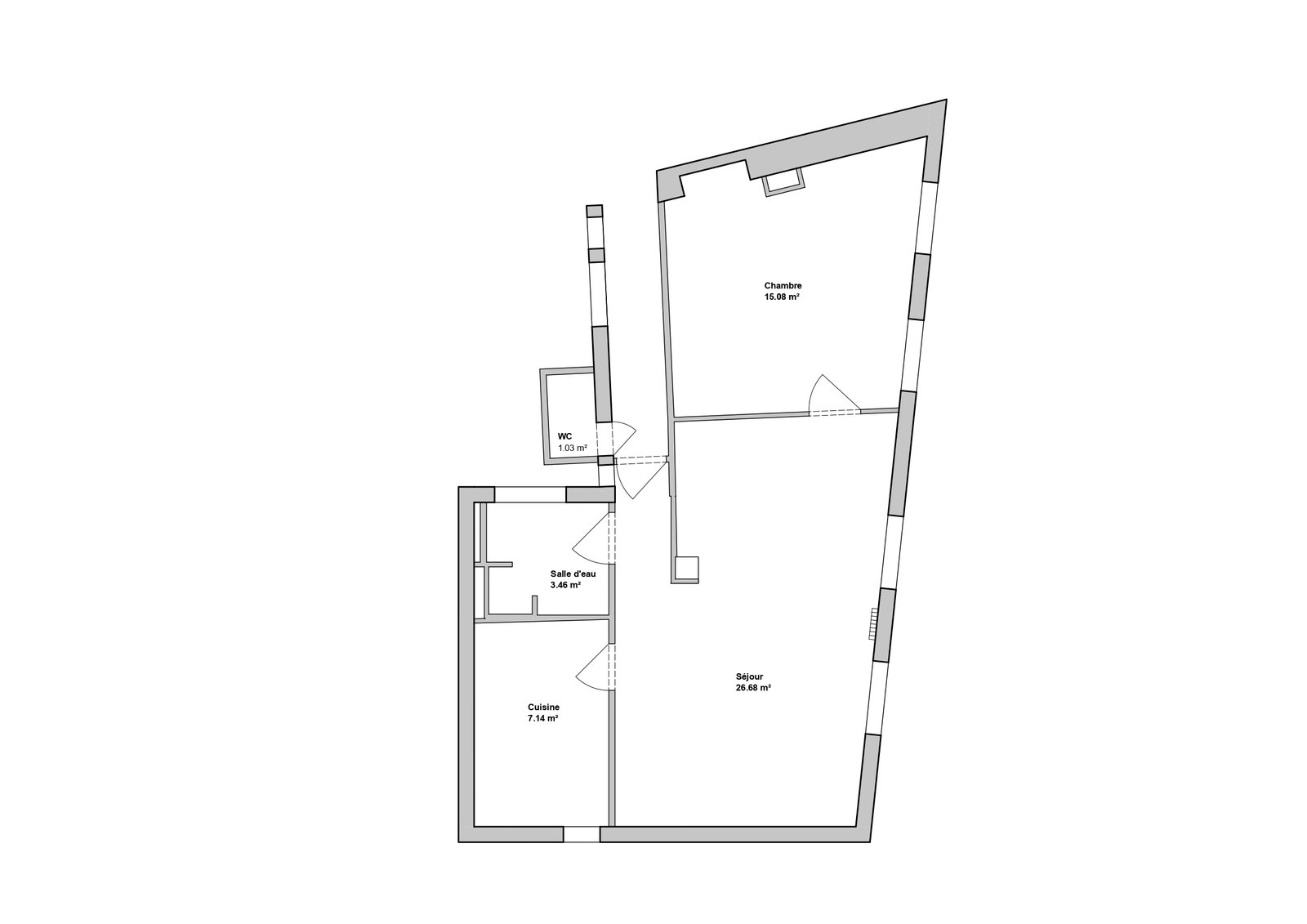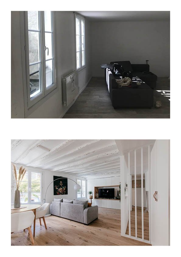 Cet appartement a été entièrement remodelé afin de répondre aux besoins de ses nouveaux occupants. Des toilettes sur le palier, jusque-là inutilisés ont été rachetés par la propriétaire et réintégrés dans l’appartement de façon à gagner quelques précieux mètres carrés.